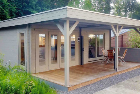 Chalet en bois KUBA 400 x 700 cm + Terrasse couverte 250×700 cm.